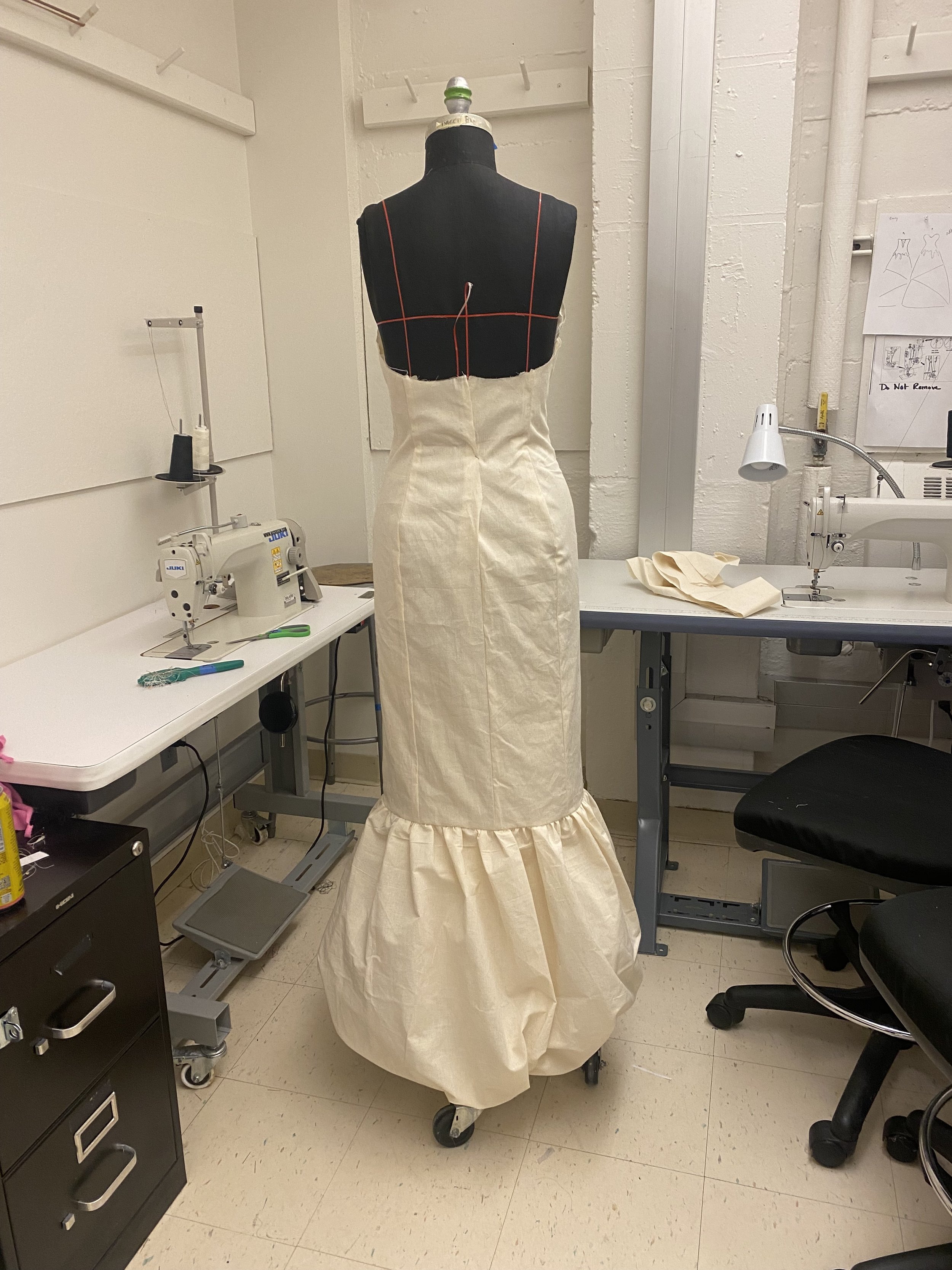 Created with the Met Gala 2024 theme in mind, ANEMONE creates controlled drama through volume and texture. To apply the feathers, I created faux metal clay bases that would allow them to stand up straight when glued in properly. I then stitched each base to the dress in a pattern that concealed the clay. The buttons on the back of the garment were also made using clay and are stitched onto a faux placket that conceals the zipper closure.